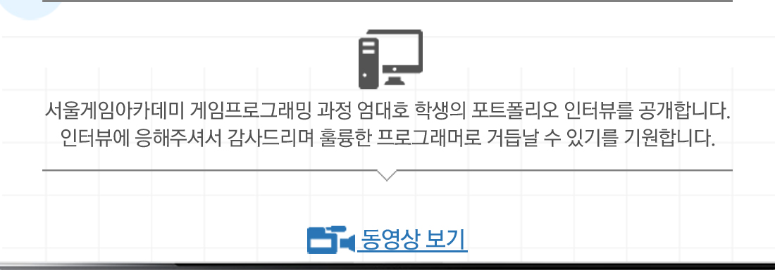엄대호 열정과 노력도 중요하지만 체력관리 또한 필수입니다.그래픽 작업이 가능한 게임 프로그래머! 대학 때 그래픽을 전공했습니다. 하지만 이번 포트폴리오 작업하면서 그래픽 제작이 제일 힘들었어요. 프로그래머 다 된 거 같아요. 하하 서울게임아카데미 게임프로그래밍 과정 이의진 학생의 포트폴리오 인터뷰입니다. 인터뷰에 응해주셔서 감사드리며 훌륭한 기획자로 거듭날 수 있기를 기원합니다. Q 담당 선생님은 누구세요? 언제나 칭찬과 격려를 아끼지 않으시고, 개인적으로 여러 번 포기하고 싶어졌을 때가 있었는데 그 때마다 쉽게 포기하지 않게 붙잡아 주신 박진형 선생님입니다.. 포기 하고 싶을 때마다 도움을 준 박진형 선생님과 도움으로 포기하지 않은 이의진 학생 Q 포트폴리오 장르는 무엇이며 어떻게 만들게 되었나요? 포트폴리오 장르는 횡스크롤 액션 게임이며, 저만의 게임을 만들고 싶어 평소 즐겨 플레이 하는 게임 오버워치의 가장 좋아하는 영웅 캐릭터를 직접 만들어 개인적으로 좋아하는 횡스크롤 장르와 접목시켜 만들게 되었습니다. Q 동영상의 하이라이트 부분 5군데만 선택해주세요. 0:39 ~ 0:50초 -> 노가다의 산물 2:40 ~ 1:44초 -> 처음 돌진으로 벽을 부숨 3:19 ~ 3:38초 -> 영웅스킬 사용 4:03 ~ 4:31초 -> 방패가 부서짐(방패HP하락시 금가는 디테일함) 6:36 ~ 7:40초 -> 보스에게 스킬난사 장면 마지막은 보너스 영상 7: 40초 ~ 8: 05초 까지 실제 게임 영상에 생각을 넣음 Q 포트폴리오를 만들면서 가장 힘들었던 점은? 프로그래밍 공부하는 학우들이라면 모두 공감할 것 같은데 일부 그래픽 리소스를 직접 제작하는 과정이 가장 힘들었습니다. 그로 인해 기능적인 부분을 많이 넣지 못한 면이 아쉬움이 남지만 저 나름대로 재미를 느껴 그 과정 또한 즐기며 제작 할 수 있었습니다. Q 후배들에게 한마디를 해준다면? 학원에서 공부를 하다 보면 포기하고 싶을 때가 한번쯤은 찾아오기 마련입니다. 그 때 포기하지 않고 버티면 분명 언젠가는 자신에게 좋은 자산이 될 것 입니다. Q 마지막으로 남기고 싶은 말이 있다면? 대학생활 때 게임그래픽을 전공하였는데, 영 맞는 것 같지 않아 뒤늦게 프로그래밍과정을 배우게 되었는데, 다소 늦은 나이에 새로이 시작 할 수 있을까 걱정이 앞섰습니다. 아니나 다를까 걱정이 현실이 되고, 이것마저도 포기하고 싶을 때가 많았습니다. 내겐 재능이 없다고 되뇌며 침울 할 때 선생님의 격려로 다시 일어날 수 있었습니다. 결국 포트폴리오 기간 거의 막바지가 되어서 완성도와 기능에 얽매이지 않고, 순수하게 만드는 과정을 즐기며 포트폴리오를 마무리 할 수 있었습니다. 마지막까지 그래픽 잘한다고 띄워준 반 학우들과 정신적 지주가 되어주신 박진형 선생님께 감사의 마음을 전합니다.