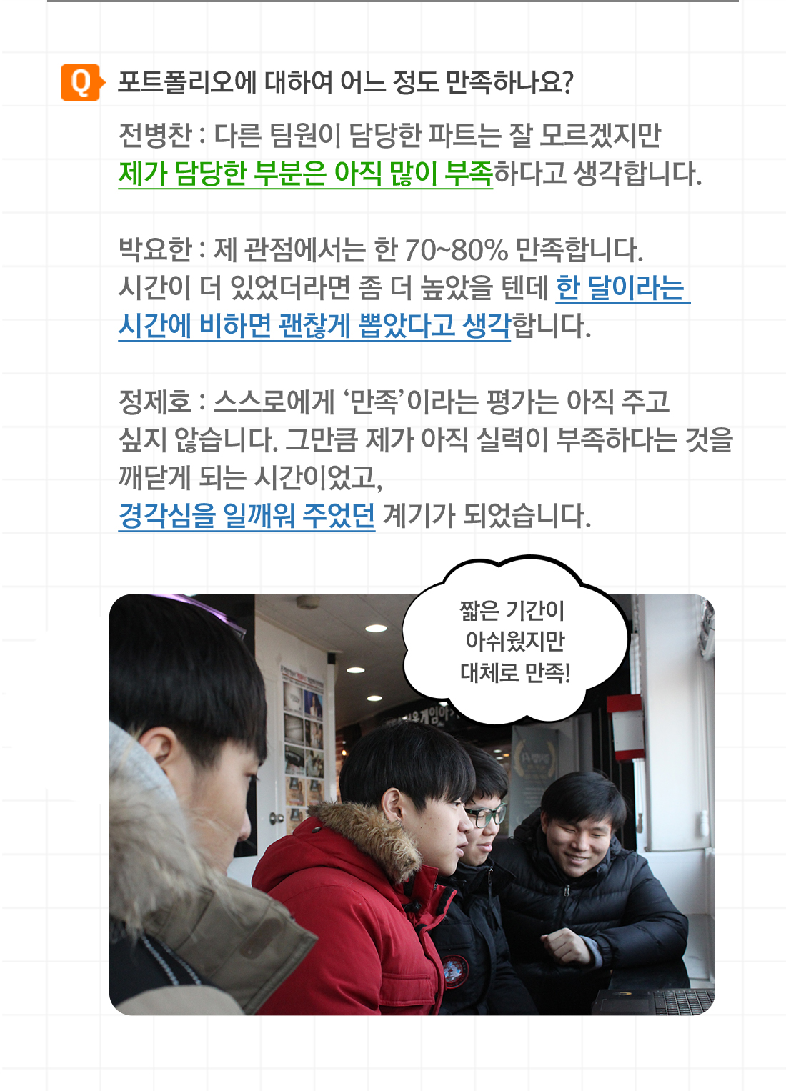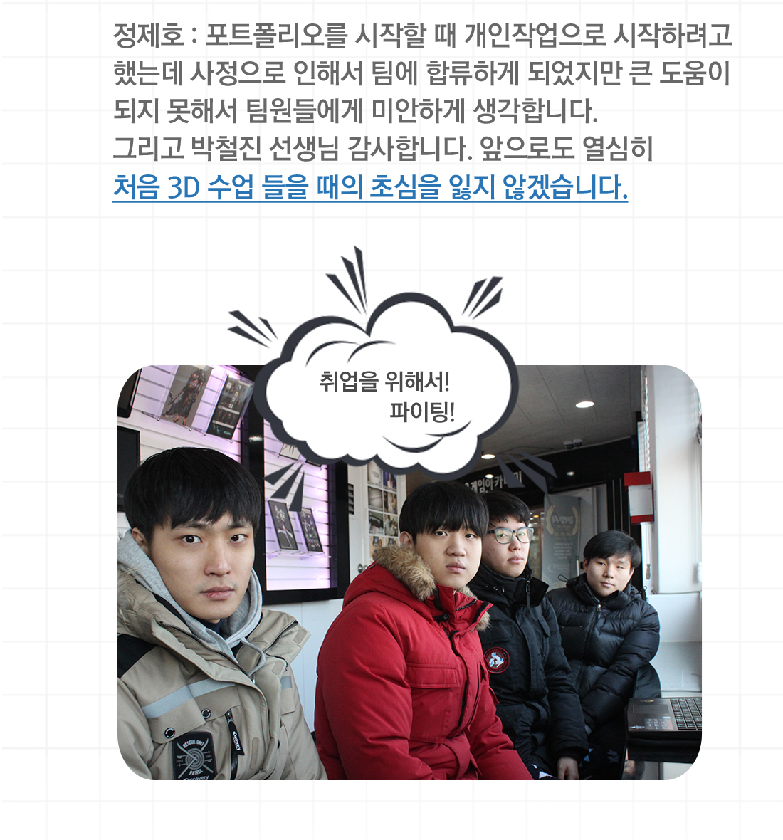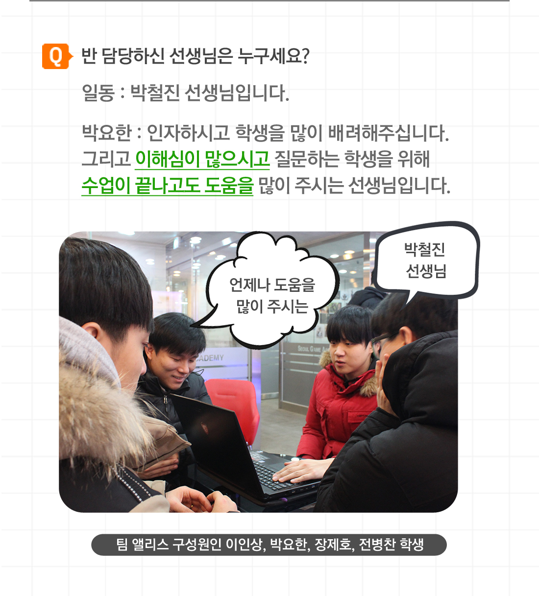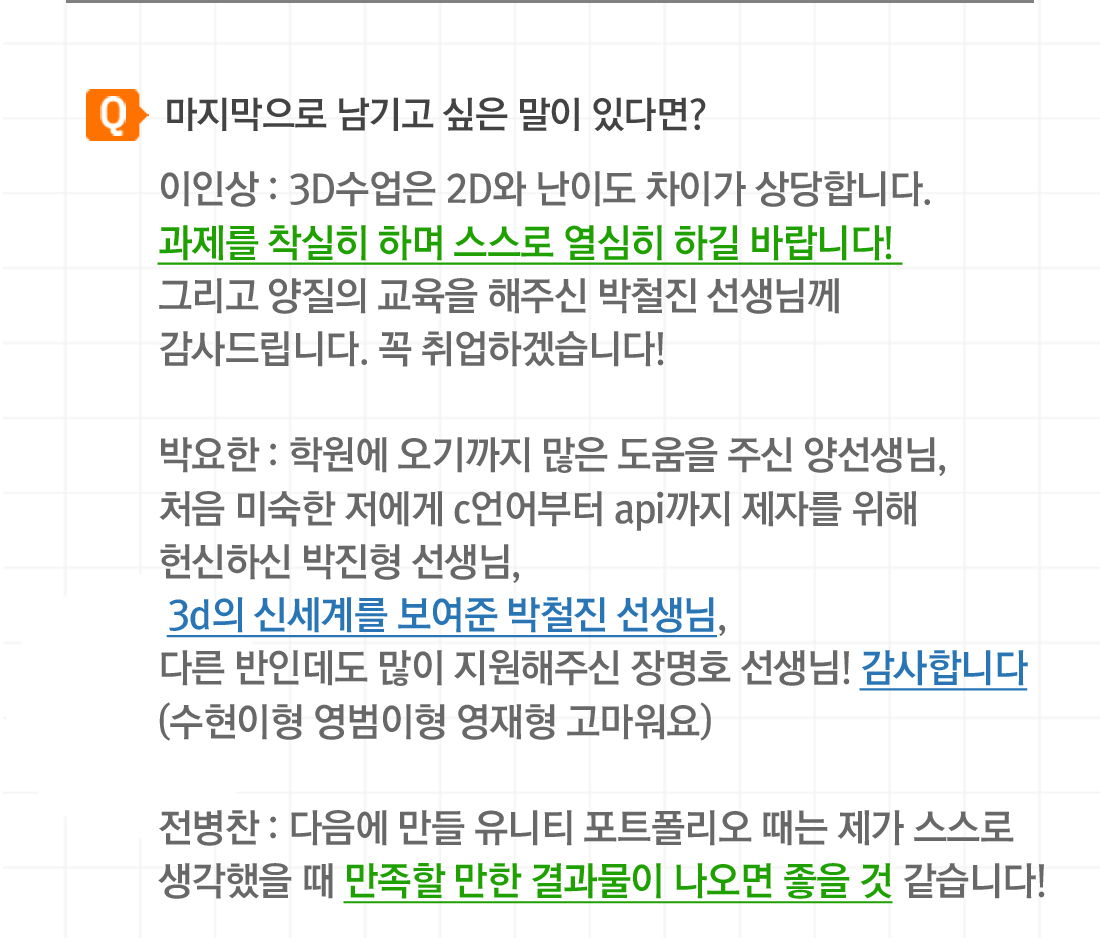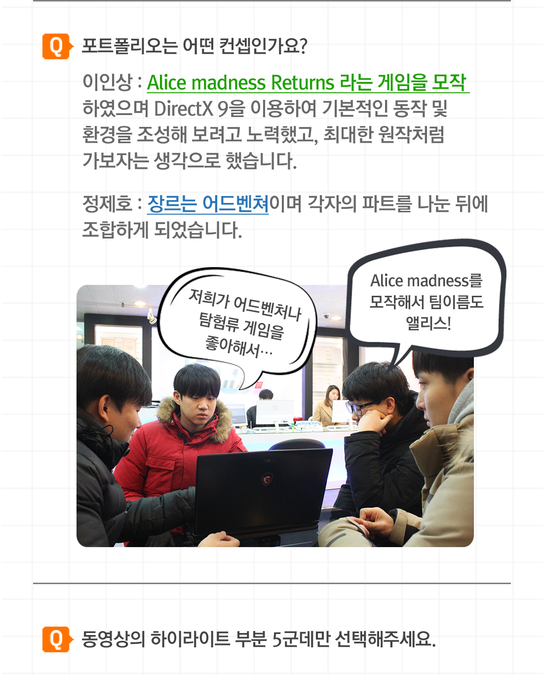 고민하지 않는 코딩은 도태되기 마련이다. 생각을 많이 하고 고민하지 않는 코딩을 한다면 점점 응용을 해야 하는 진도에서 힘들어질 수 있습니다. 그저 따라하는 코딩이 아닌 생각하고 응용하는 코딩을 하세요! 서울게임아카데미 게임프로그래밍 과정 팀 앨리스의 포트폴리오 인터뷰를 공개합니다. 인터뷰에 응해주셔서 감사 드리며 훌륭한 프로그래머로 거듭날 수 있기를 기원합니다. Q. 반 담당하신 선생님은 누구세요? 일동 : 박철진 선생님입니다. 박요한 : 인자하시고 학생을 배려해주시는 이해심 많으시고 질문하는 학생을 위해 친절히 수업 끝나고도 도움을 많이 주시는 선생님입니다. Q. 포트폴리오는 어떤 컨셉인가요? 이인상 : Alice madness Returns 라는 게임을 모작 하였으며 DirectX 9을 이용하여 기본적인 동작 및 환경을 조성해 보려고 노력했고, 최대한 원작처럼 가보자는 생각으로 했습니다. 정제호 : 장르는 어드벤쳐이며 각자의 파트를 나눈 뒤에 조합하게 되었습니다. Q. 동영상의 하이라이트 부분 5군데만 선택해주세요. 1. 메인화면과 사운드 0:10 ~ 1:00 2. 맵전체 오브젝트 설치 4:40 ~4:47 3. 쉐이더를 이용한 물제작 5:35 ~ 5:45 4. 게임컨텐츠 소인화를 이용한 물체 통과 9:55 ~ 10:10 5. 소인화 물체 보이기 10:50 ~ 11:15 6. 보스몬스터 10:00 ~ 11:00 Q. 포트폴리오에 대하여 어느 정도 만족하나요? 전병찬 : 다른 팀원이 담당한 부분에 대해서는 잘 모르겠지만 제가 담당한 부분은 아직 많이 부족하다고 생각합니다. 박요한 : 제 관점에서는 한 70~80% 만족합니다. 시간이 더 있었더라면 좀 더 높았을 텐데 한 달이라는 시간에 비하면 괜찮게 뽑았다고 생각합니다.정제호 : 스스로에게 ‘만족’이라는 평가는 아직 주고 싶지 않습니다. 그만큼 아직 저에게 실력이 아직 많이 부족하다는 것을 깨닫게 되는 기간이었고, 경각심을 일깨워주었던 계기가 되었습니다. Q. 마지막으로 남기고 싶은 말이 있다면? 이인상 : 3D수업은 2D와 난이도 차이가 상당합니다. 과제 착실히 하며 스스로 열심히 열심히 하길 바랍니다! 그리고 양질의 수업을 교육해주신 박철진 선생님께 감사드립니다. 꼭 취업하겠습니다! 박요한 : 학원에 오기까지 많은 도움을 주신 양선생님, 처음 미숙한 저에게 c언어부터 api까지 제자를 위해 헌신하신 박진형 선생님, 3d의 신세계를 보여준 박철진 선생님, 다른 반인데도 많이 지원해주신 장명호 선생님! 감사합니다. (수현이형 영범이형 영재형 고마워요) 전병찬 : 다음에 만들 유니티 포트폴리오 때는 제가 스스로 생각했을 때 만족할 만한 결과물이 나오면 좋을 것 같습니다! 정제호 : 포트폴리오를 시작할 때 개인작업으로 시작하려고 했는데 사정으로 인해서 팀에 합류하게 되었지만 큰 도움이 되지 못해서 팀원들에게 미안하게 생각합니다. 그리고 박철진 선생님 감사합니다. 앞으로도 열심히 처음 3D 수업 들을 때의 초심을 잃지 않겠습니다.