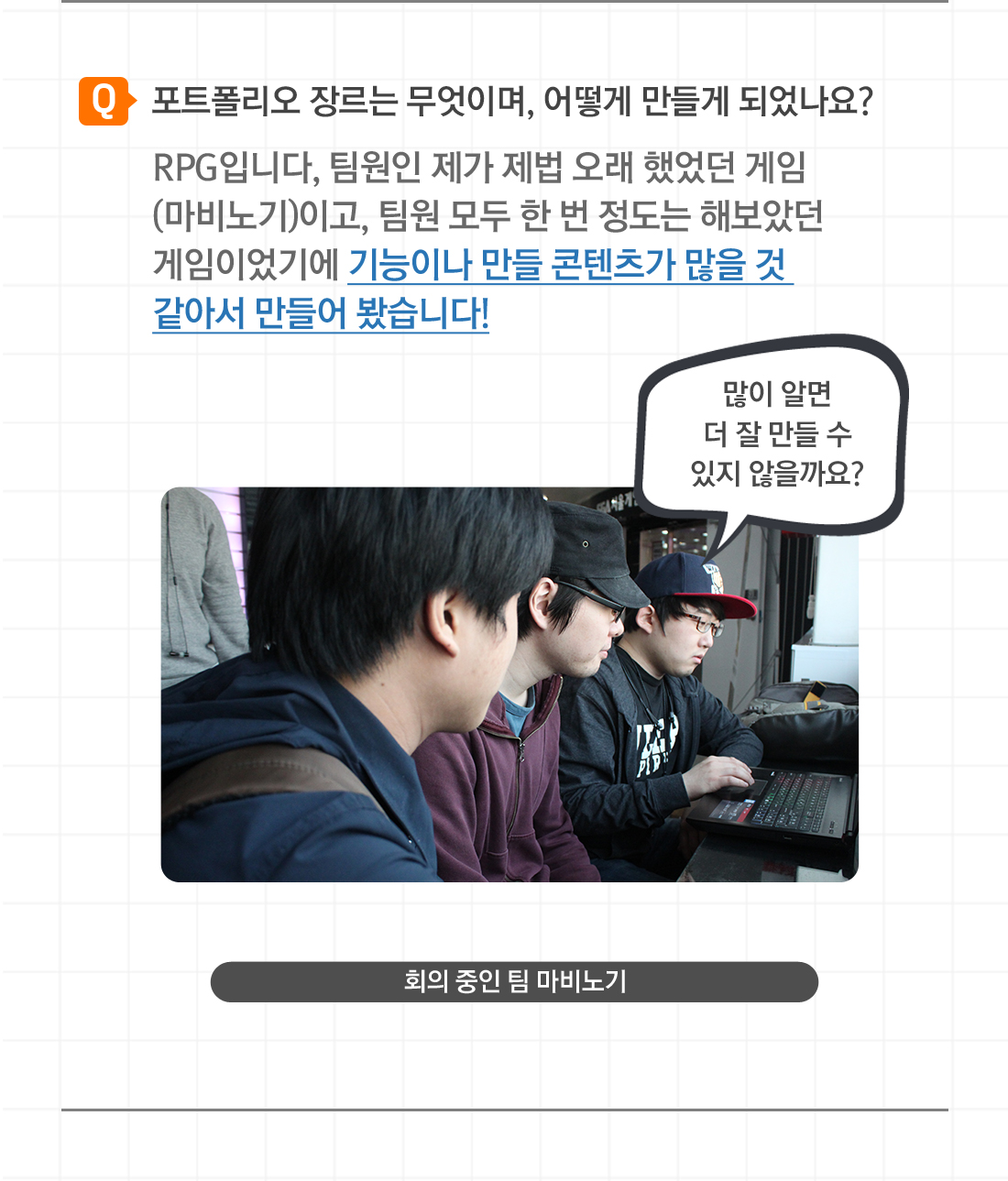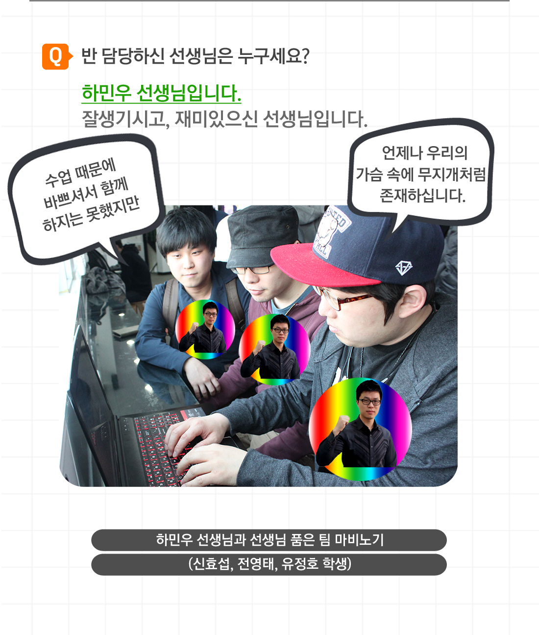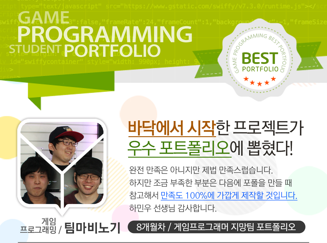 아직 배울 것이 많긴 하지만 눈에 보이는 실력향상! 팀장인 반준기 학생을 중심으로 실력향상을 위한 포트폴리오를 제작했습니다. 포폴을 마치고 보니 진짜 실력이 눈에 띄게 향상됨을 느꼈습니다! 서울게임아카데미 게임프로그래밍 과정 팀 게인조의 포트폴리오 인터뷰를 공개합니다. 인터뷰에 응해주셔서 감사 드리며 훌륭한 프로그래머로 거듭날 수 있기를 기원합니다. Q. 반 담당하신 선생님은 누구세요? 일동 : 유쾌하고 재미있는 박진형 선생님입니다. 쏟아지는 과제는 항상 감사히 생각하고 있습니다. Q. 포트폴리오 장르는 무엇이며 어떻게 만들게 되었나요? 슈팅 로그라이크 게임입니다 막내인 지호의 강력추천으로 만들게 되었습니다 Q. 동영상의 하이라이트 부분 3군데만 선택해주세요. 1. 탄피 / 수류탄의 그림자에 대해서 설명하는 부분 4:00~4:40 (40초) 2. z_order와 가상의 z축을 이용한 파리 몬스터 설명 6:12~6:45 (30초) 3. 보스 미사일 부분 7:20~7:50 (30초) Q. 포트폴리오에서 어떤 부분을 맡으셨나요? 반준기 : 팀장 및 프레임워크제작과 이펙트,아이템 제작을 맡았습니다. 민태규 : 마지막 보스분을 맡았습니다. 장승연 : 맵과 INTROSCENE, UI를 맡았습니다. 조덕신 : 보스를 제외한 에너미 부분을 맡았습니다. 에너미 매니저에 에너미클래스를 상속받은 3가지의 몬스터와 총알부분을 만들었습니다. 한지호 : 캐릭터 제작 부분을 맡았습니다.Q. 후배들에게 한마디를 해준다면? 반준기 : 포인터 공부 하시길…민태규 : 자기 스스로 공부하는 습관이 중요합니다. 파이팅 하세요! 조덕신 : 선생님이 주신 과제를 하나하나 해결하고 주변 동기들에게 모르는 거 물어보다 보면 어느새 실력이 늘어있는 자신의 모습을 볼 수 있을 거에요. 포기하지 말고 꾸준히 하시길 Q. 마지막으로 남기고 싶은 말이 있다면? 민태규 : 중요한 일을 이루려 노력할 때 사람들의 말에 너무 신경쓰지 않는 것이 좋습니다. 장승연 : 노력하기 전에는 재능을 탓하지 말라 조덕신 : 실컷 잠을 자고 싶습니다….
