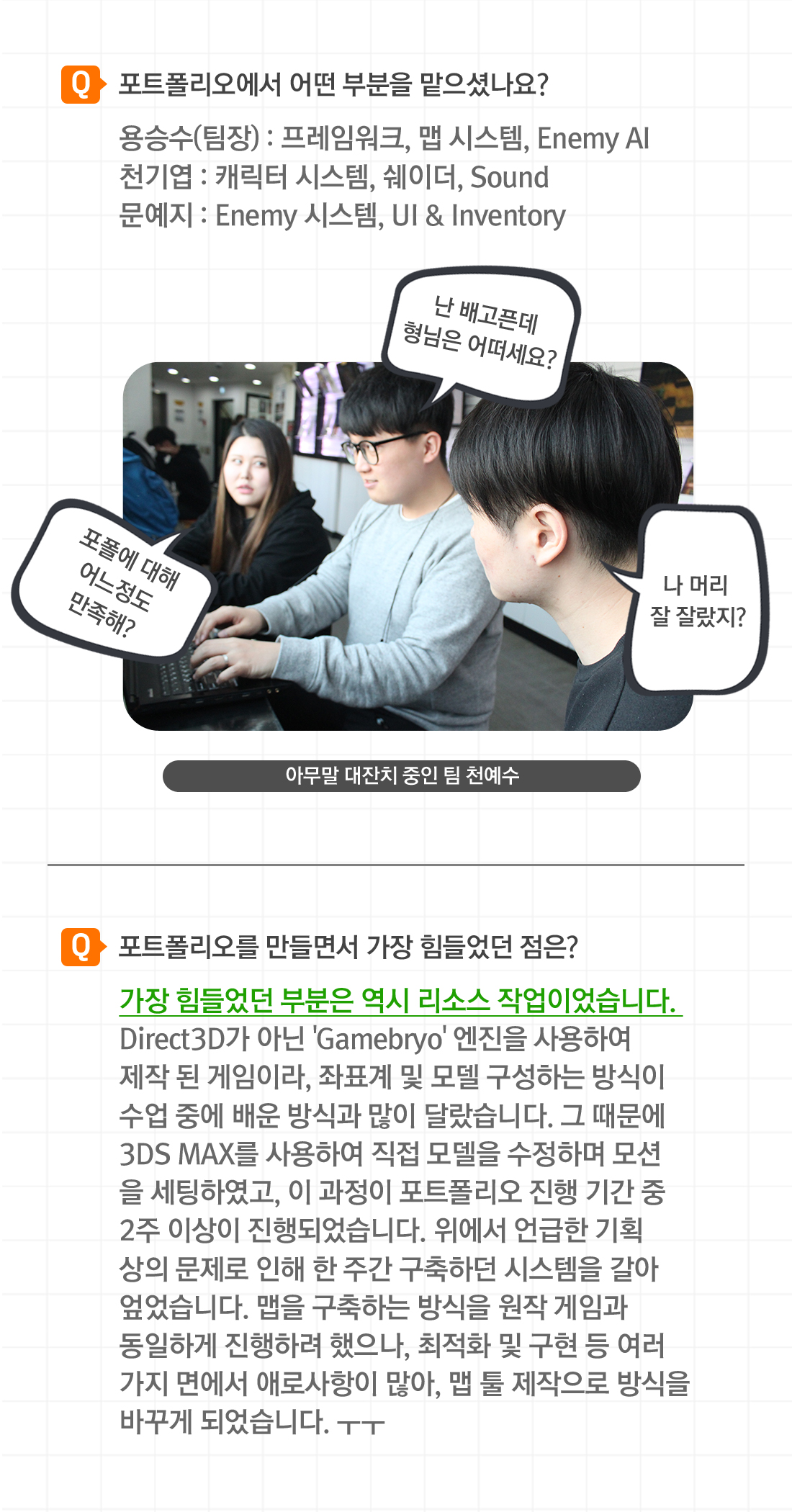 아직 배울 것이 많긴 하지만 눈에 보이는 실력향상! 팀장인 반준기 학생을 중심으로 실력향상을 위한 포트폴리오를 제작했습니다. 포폴을 마치고 보니 진짜 실력이 눈에 띄게 향상됨을 느꼈습니다! 서울게임아카데미 게임프로그래밍 과정 팀 게인조의 포트폴리오 인터뷰를 공개합니다. 인터뷰에 응해주셔서 감사 드리며 훌륭한 프로그래머로 거듭날 수 있기를 기원합니다. Q. 반 담당하신 선생님은 누구세요? 일동 : 유쾌하고 재미있는 박진형 선생님입니다. 쏟아지는 과제는 항상 감사히 생각하고 있습니다. Q. 포트폴리오 장르는 무엇이며 어떻게 만들게 되었나요? 슈팅 로그라이크 게임입니다 막내인 지호의 강력추천으로 만들게 되었습니다 Q. 동영상의 하이라이트 부분 3군데만 선택해주세요. 1. 탄피 / 수류탄의 그림자에 대해서 설명하는 부분 4:00~4:40 (40초) 2. z_order와 가상의 z축을 이용한 파리 몬스터 설명 6:12~6:45 (30초) 3. 보스 미사일 부분 7:20~7:50 (30초) Q. 포트폴리오에서 어떤 부분을 맡으셨나요? 반준기 : 팀장 및 프레임워크제작과 이펙트,아이템 제작을 맡았습니다. 민태규 : 마지막 보스분을 맡았습니다. 장승연 : 맵과 INTROSCENE, UI를 맡았습니다. 조덕신 : 보스를 제외한 에너미 부분을 맡았습니다. 에너미 매니저에 에너미클래스를 상속받은 3가지의 몬스터와 총알부분을 만들었습니다. 한지호 : 캐릭터 제작 부분을 맡았습니다.Q. 후배들에게 한마디를 해준다면? 반준기 : 포인터 공부 하시길…민태규 : 자기 스스로 공부하는 습관이 중요합니다. 파이팅 하세요! 조덕신 : 선생님이 주신 과제를 하나하나 해결하고 주변 동기들에게 모르는 거 물어보다 보면 어느새 실력이 늘어있는 자신의 모습을 볼 수 있을 거에요. 포기하지 말고 꾸준히 하시길 Q. 마지막으로 남기고 싶은 말이 있다면? 민태규 : 중요한 일을 이루려 노력할 때 사람들의 말에 너무 신경쓰지 않는 것이 좋습니다. 장승연 : 노력하기 전에는 재능을 탓하지 말라 조덕신 : 실컷 잠을 자고 싶습니다….