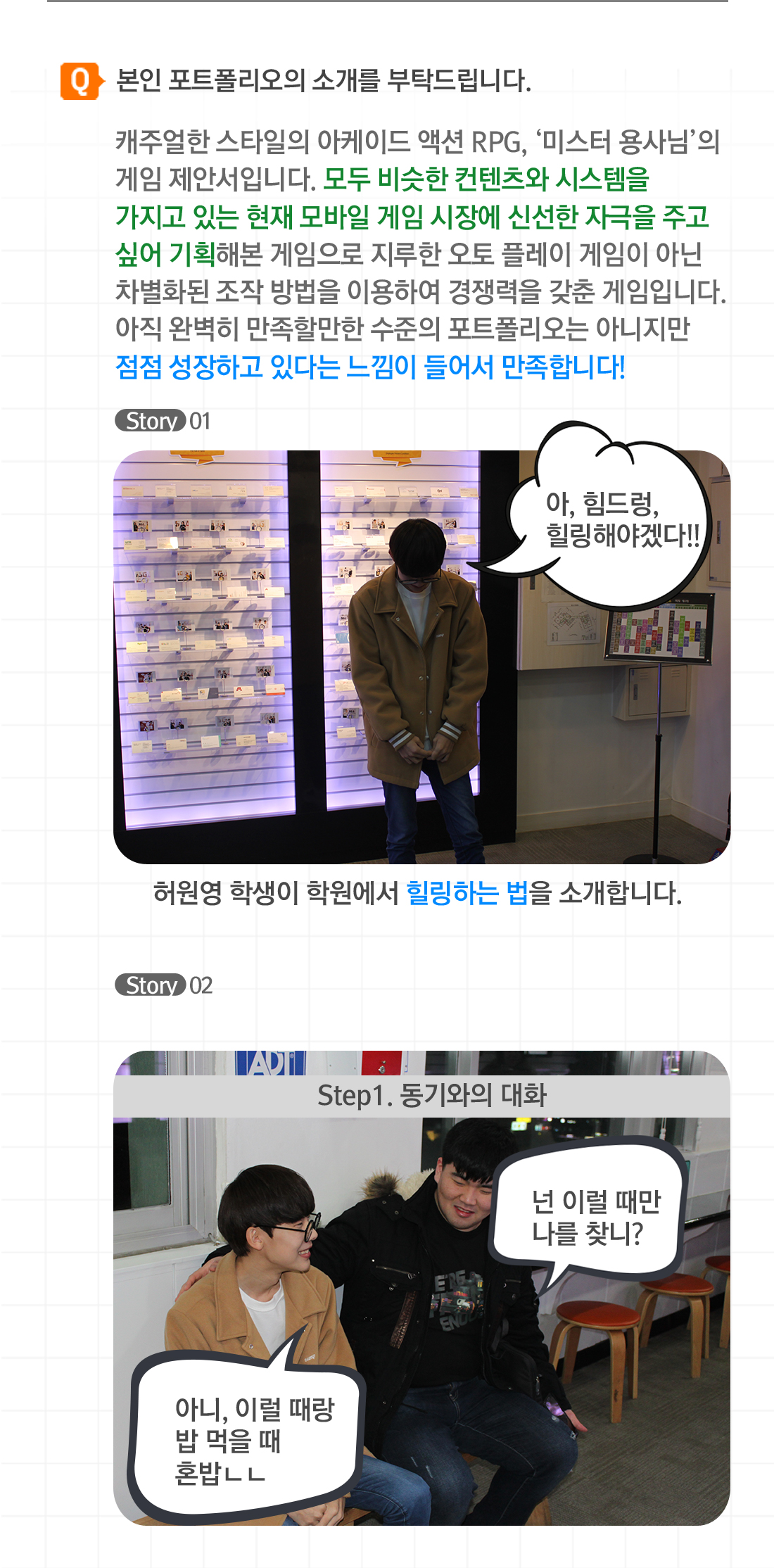 초심을 잃지 말고 나만의 포트폴리오를 만드세요! 기획자의 길은 멀고도 험합니다. 그 길을 혼자 가려고 하지 말고 주변 동료들과 많은 시간을 보내면서 정보도 공유하고 힐링하는 시간도 가지세요! 미스터 용사님 제안 기획서 서울게임아카데미 게임기획 과정 허원영 학생의 포트폴리오 인터뷰를 공개합니다. 인터뷰에 응해주셔서 감사 드리며 훌륭한 기획자로 거듭날 수 있기를 기원합니다. Q. 반을 담당하신 선생님은 누구세요? 항상 날카롭게 피드백을 해주시고 저희들에게 신경을 안 쓰는 척 하시지만, 은근히 따뜻하게 잘 챙겨주시는 자랑스러운 최효석 선생님이십니다! (츤츤츤데레) 자유롭게 기획서를 쓸 수 있게 해주시되 잘못된 부분이 있으면 바로 바로 지적해주시고 저만의 문서 스타일을 만들 수 있게 항상 노력해주시는 모습이 아주 아름다우신(!?) 선생님입니다 ㅎㅎ Q. 본인 포트폴리오의 소개를 부탁합니다. 캐주얼한 스타일의 아케이드 액션 RPG, ‘미스터 용사님’의 게임 제안서입니다. 모두 비슷한 컨텐츠와 시스템을 가지고 있는 현재 모바일 게임 시장에 신선한 자극을 주고 싶어 기획해본 게임으로 지루한 오토 플레이 게임이 아닌 차별화된 조작 방법을 이용하여 경쟁력을 갖춘 게임입니다. 아직 완벽히 만족할만한 수준의 포트폴리오는 아니지만 점점 성장하고 있다는 느낌이 들어서 만족합니다! Q. 포트폴리오를 만들면서 가장 힘들었던 점은 무엇인가요? 머릿속에 있는 아이디어가 제 손을 통해 기획서가 되는 과정은 굉장히 뿌듯합니다! 하지만, 그만큼 시간이 오래 걸리는 작업이다 보니 체력이 부족하다는 것을 느꼈습니다. 지금은 수면이나, 운동 등 다양한 활동을 통해서 체력이라는 단점을 극복하는 중입니다. Q. 후배들에게 하고 싶은 말이 있다면? 기획이라는 분야가 쉽게 생각할 수도 있고, 누구나 한다고 생각할 수도 있는데 그만큼 경쟁자도 많고 제대로 된 실력을 쌓는데 시간도 오래 걸린다고 생각합니다. 그 과정에서 주변에 함께 고생하는 사람들과 자주 얘기를 나누며 힐링도 하고, 도움을 받으면서 나만의 포트폴리오를 만드는데 집중하세요! 끝까지 초심을 잃지 않고 의미 있는 시간을 보낸다면 자기 자신이 만족할만한 자랑스러운 포트폴리오가 만들어지지 않을까요? 모두 노력한 만큼 성과가 있기를 기원합니다! Q. 마지막으로 남기고 싶은 말이 있다면? 포폴 준비하면서 체력이 부족해 많이 힘들었어요. 그런데 앞으로는 힘든 시간도 더 많을 것이고, 가끔은 크게 흔들리겠죠… 그럴 때마다 마음을 다잡고 초심을 생각하며 제 자신을 크게 응원하며 이겨내고 싶습니다.
