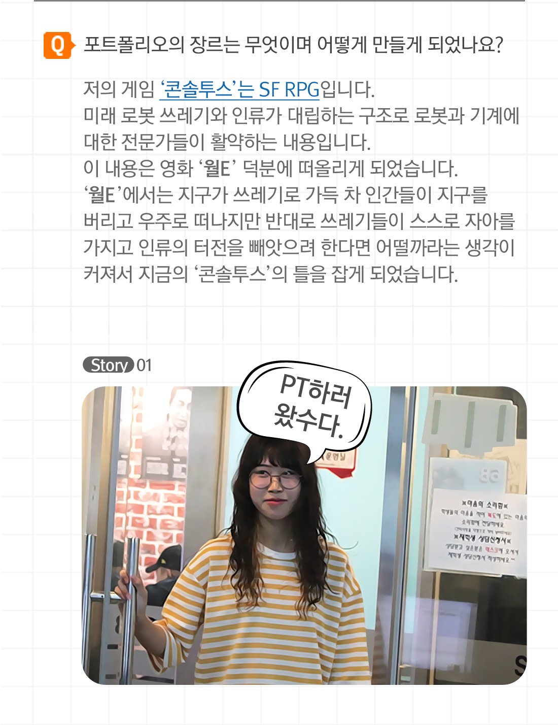 이해가 안 된다면 이해가 될 때까지 무한 질문을 하라 원래 유아교육을 전공하고 싶었지만 게임을 도저히 포기할 수 없어서 고민 끝에 SGA서울게임아카데미를 찾았습니다. 그 선택은 지금 생각해도 BEST CHOICE 서울게임아카데미 게임기획 과정 권나래 학생의 포트폴리오 인터뷰를 공개합니다. 인터뷰에 응해주셔서 감사 드리며 훌륭한 기획자로 거듭날 수 있기를 기원합니다. Q. 반을 담당하신 선생님은 누구세요? 최효석 선생님 이십니다! 최효석 선생님은 정말 무뚝뚝해 보이시고, 칼 같은 분이시지만 츤데레의 따뜻함이 있죠! 가끔씩 던져주시는 피드백은 가뭄같은 기획서의 단비와 같죠! 제가 가끔 몸이 한 번씩 아프고 그러는데 그럴 때마다 꼭 제가 없을 때 걱정을 많이 해주신다 하더라구요…. 어찌나 마음이 너무나도 따뜻하셔서….헤어 나올 수가 없어요! Q. 포트폴리오의 장르는 무엇이며 어떻게 만들게 되었나요? Dual Personality [듀얼 퍼스널리티]는 PC플랫폼의 핵앤슬래시&MMORPG입니다. 학원 오기 전, FPS만 즐겨했던 제가 처음으로 RPG에 빠진 게임이 있었습니다. 22살이라는 나이에 현질을 그렇게나 많이.... 아무튼 그래서인지 더욱 더 애착이 가고정말 열심히 했습니다만 결국 그 게임은 사라졌었죠.. 그래서 ’그리운 마음에 기획서라도 써보자..!’ 라는 심정에 만들게 되었습니다. Q. 포트폴리오에서 무엇이 아쉽고 무엇이 힘들었나요? 처음 써보는 포트폴리오여서 그런지..머릿속에 있는걸 다 담자니, 너무 많고.. 정리도 안 됐어요. 예상은 했었지만 문서화 시키는 게 정말 너무 힘들었던 것 같아요. 분명 제 머릿속에 있는 아이디어들인데 저도 잘 모르는 것 같고.. 이게 뭥미 싶었어요. 그래도 무사히 끝내서 ..정말 다행입니다! Q. 향후 계획이 있으면 들려주세요. 이제 곧 데이터밸런스 특강이 열리는데, 듣고 싶었던 것 중 하나여서 바로 신청을 했죠! 학원에서 해주는 특강 중에서 제가 듣고 싶거나 최효석 선생님과 상담을 해서 정말 필요한 특강이 있다면, 계속 꾸준히 듣고 싶어요. 학원에서 진행되는 다양한 특강을 들어서 빨리 실력을 업그레이드 하고 싶습니다. Q. 마지막으로 남기고 싶은 말이 있다면? 저는 원래 유아교육을 전공 하고 싶었습니다. 그런데 도저히 게임을 포기하면서 살고 싶지가 않더라구요. 그래서 게임 관련된 직업을 찾아보는데, 게임 기획, 프로그래밍, 3D그래픽, 원화 등… 엄청 많다는 것을 알고, 친구랑 상의하다가 학원을 소개받게 되었습니다. 서울게임아카데미에 온 것을 절대로 후회하진 않을 것 같아요. 기분 좋게 학원을 떠나는 날까지 열심히 배우겠습니다.